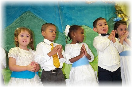 intently listening to the children's wish lists. The American Bible Society hosted Felix Price an Nuyorican guitarist and puppeteer.